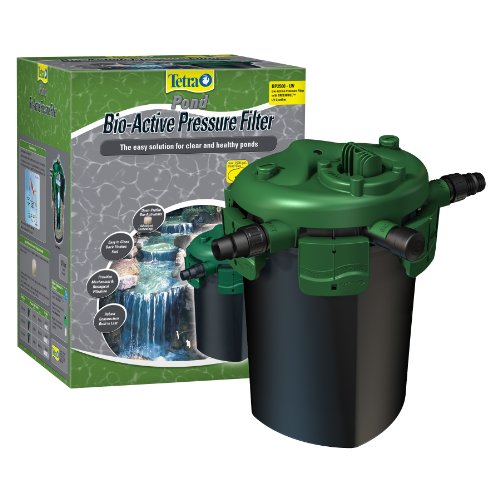 Tetra Pond Bio-Active Pressure Filter with UV Clarifier BP2500-UV is designed for ponds up to 2500 gallons. Bio-Active Pressure Filters provide mechanical and biological filtration to help maintain clear and healthy pond water. Its unique open profile bio-activators provide large surface area and unrestriced water flow to all surfaces for improved cleaning. It is designed with an easy, backflush valve for fast cleaning. This filter also integrates an Ultra-Violet Clarifier that provides permanent control of suspended algae which cause green water. UL listed and includes a 2 year limited warran